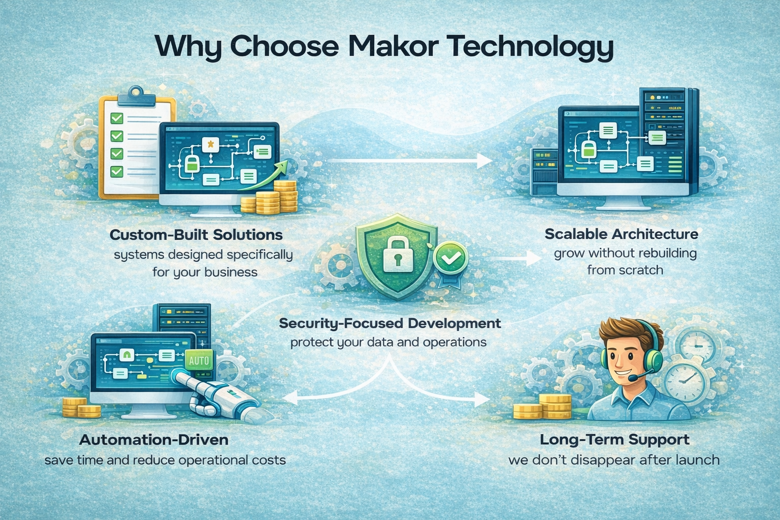 Modern businesses need more than off-the-shelf software. They need systems that fit how they actually operate. At Makor Technology, we design and build custom business systems that improve efficiency, reduce manual work, and support long-term growth.